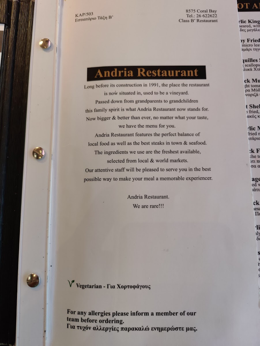 Welcome to Andria Steak And Grill Restaurant, an exquisite dining destination in Peyia, Cyprus. Renowned for its exceptional culinary offerings, Andria specializes in perfectly cooked steaks that melt in your mouth. Guests rave about the surf and turf, a feast for the eyes and palate alike, showcasing a masterful blend of flavors.